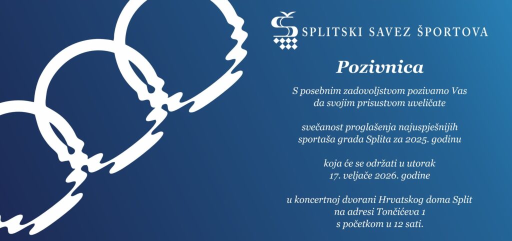 S posebnim zadovoljstvom pozivamo Vas na svečanost proglašenja dobitnika Godišnje nagrade Splitskog saveza športova za 2025. godinu, koja će se održati u utorak, 17. veljače 2026. godine, u Hrvatskom domu Split – Koncertnoj dvorani Ive Tijardovića, na adresi Tončićeva 1, s početkom u 12.00 sati.